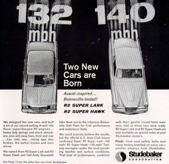 Super Hawks are specially equipped 1963-64 Studebaker GT Hawks that came from the factory with Avanti powered engines. You had the optional choice of either R-1 to R-4 289/304 Engines which give your Hawk alot more pickup for your Saturday Night Drag race or just heading down the highway. Larks could be also equipped with the Avanti Powered Engines as an option. Very few Super Hawks were produced from the Factory and if concerned about if it was factory equipped you can contact the Studebaker Museum and for small fee (presently $33) you can get a build sheet of the Studebaker in question. This will inform you how your Studebaker came off the assembly line.